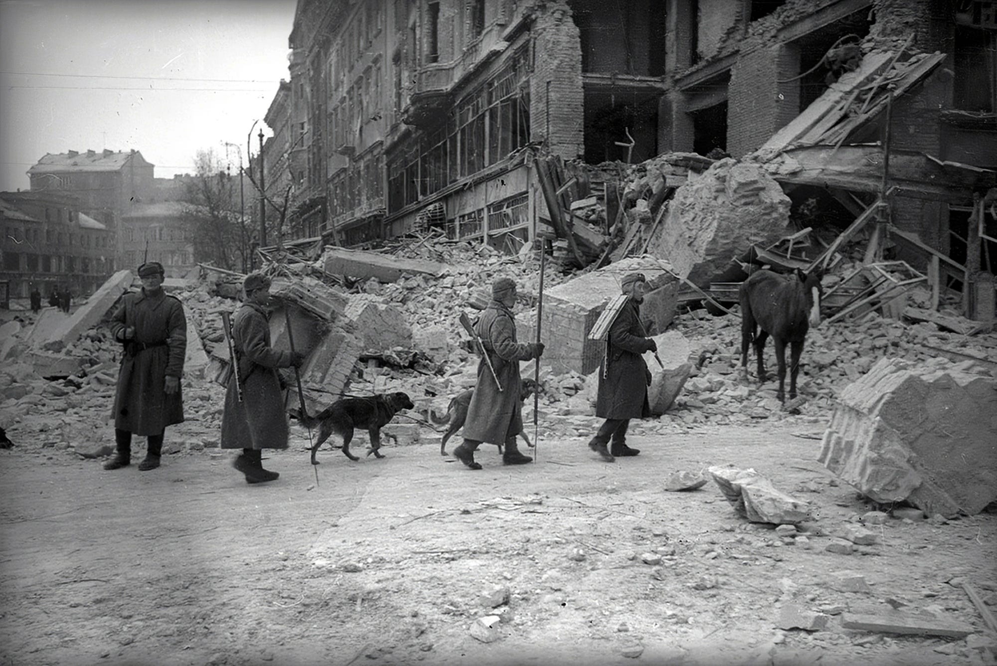 Across the Danube, the Pest side of the city sustained less damage, fighting was over by mid-January. The Soviets started to scope out the area. In some pictures, the occupying army looks almost cute.
